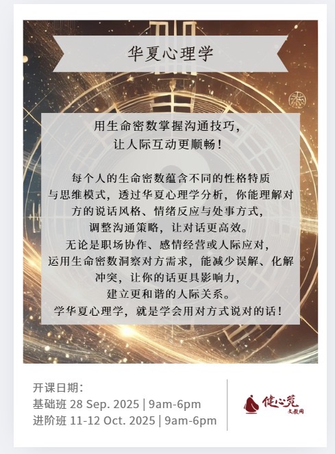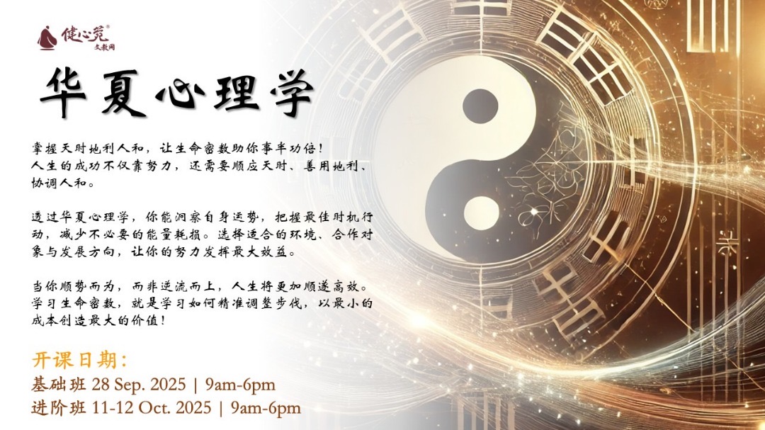『华夏心理学』传承中华哲理的智慧结晶,以“易经”蕴含的命理学,结合现代“心理学”的应用,了解人的思维及行为的关系。透过研究“生命密数”的历程,觉察人的先天气质与后天环境间的影响,找寻天地人合一的方法,帮助自己掌握自身的命运。